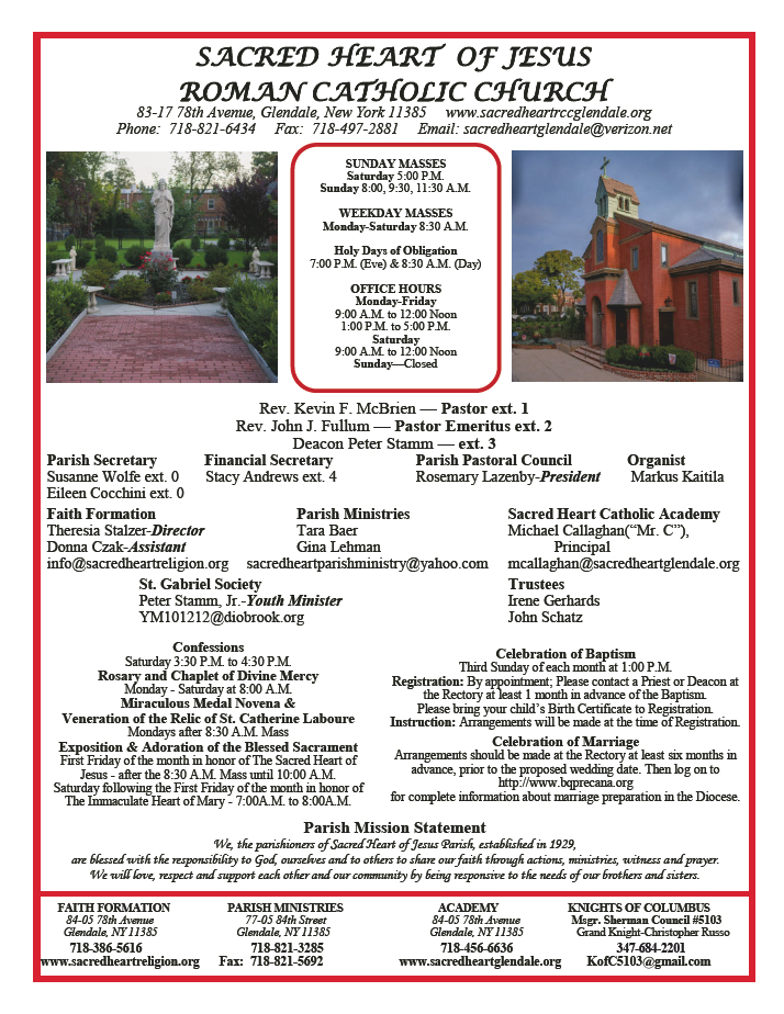 First Friday of the month in honor of The Sacred Heart of Jesus – after the 8:30 A.M. Mass until 10:00 A.M. and Saturday following the First Friday of the month in honor of The Immaculate Heart of Mary – 7:00 A.M. to 8:00 A.M.
